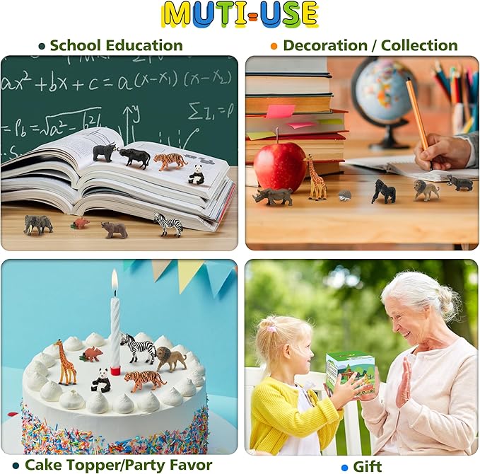 - β AWESOME SAFARI ANIMAL CAKE TOPPER - There are many mini zoo animals, it would be a good idea to use them as the cake toppers and make a safari animals-themed cake for your kids. Such cute & different varieties of animal figures are worth to be collected, decorating children's bookcase, desk and room. It's an awesome birthday gift or prize for kids, they would love that so much.