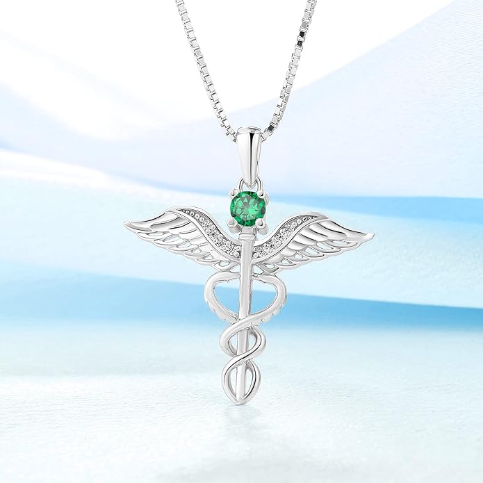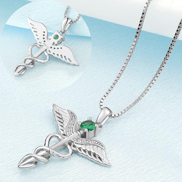 YL Caduceus Necklace Sterling Silver Doctor Nurse Themed Pendant Birthstone Angel Wings Snake Jewelry for Women