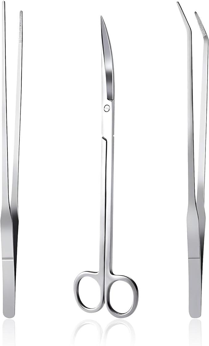 - Aquascaping tools, 3 in 1, a 9.8" curved scissor, a 10.6" curved and a 10.6" straight tweezer, and the long handles on these tools are more convenient than planting or trimming by hands.