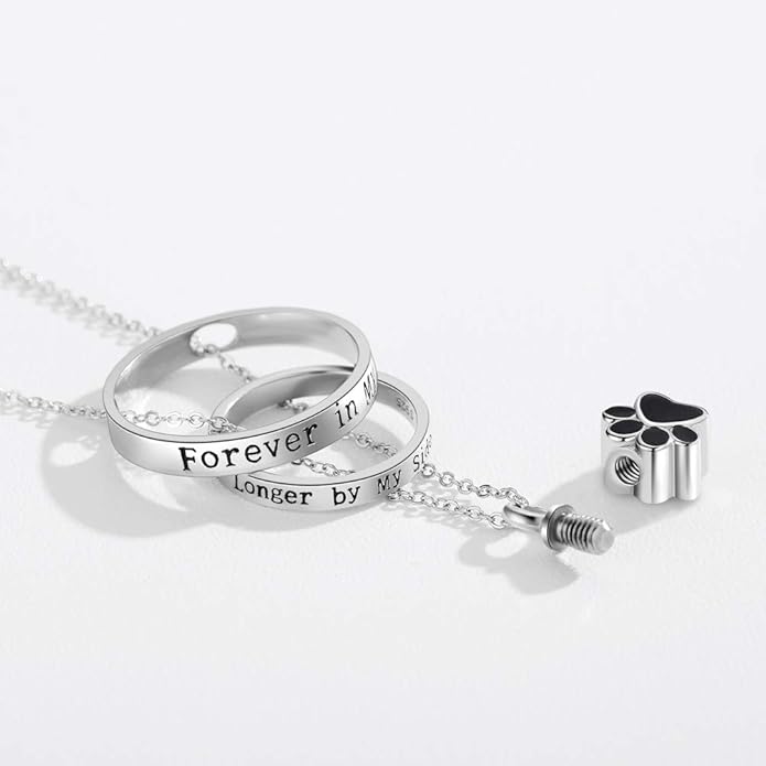 - Theme -- "No longer by my side, Forever In My Heart". This cremation necklace is designed with pet paw, symbolizes the precious memories between you and your pet. Special way to memorialize your furry friend forever, close to your heart urn necklace. It will always be with you, wherever you are.