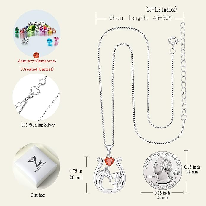 YL Women's Horse Necklace 925 Sterling Silver Horseshoe Pendant Birthstone Animals Jewelry