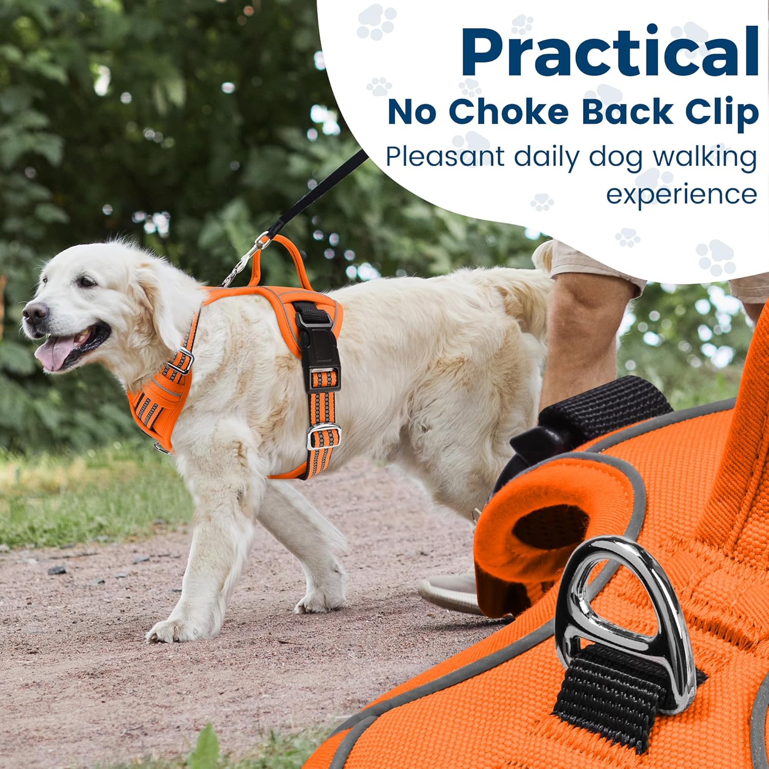 Funfox Dog Harness No Pull, Adjustable Pet Vest Harness, Super Soft Material with Vertical Handle Easy Control, Reflective Night Walking, 2 Leash Clips for XLarge Dogs, Orange, XL
