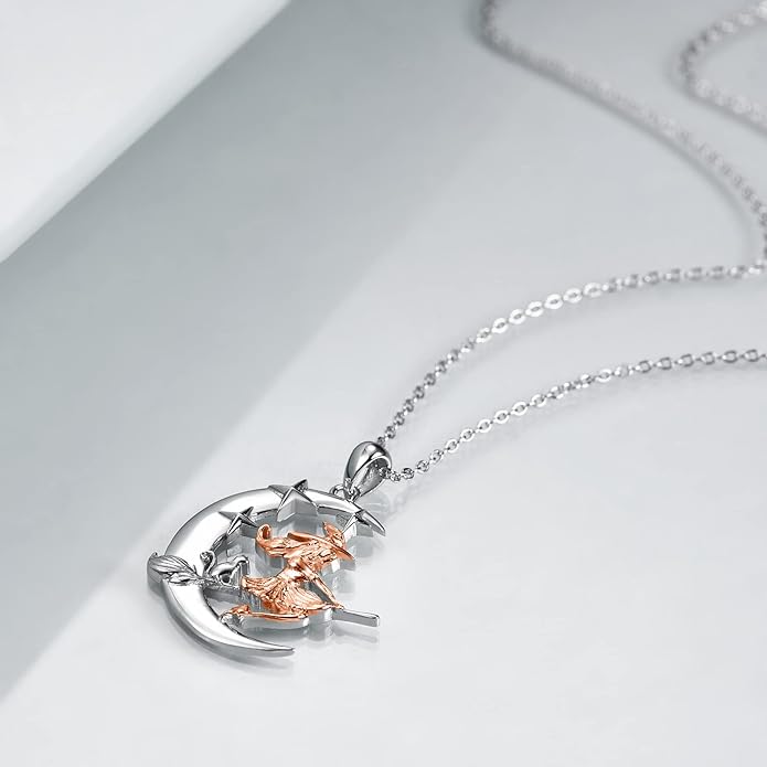 - ★Witch Hanging on Broom with Cat★ Witch crescent moon necklace design with a witch full of fairy tale flying through town on broom element. On Halloween, the witch is sitting on a broom and flying around, meaning that it will disperse all evil things and bring good luck.
