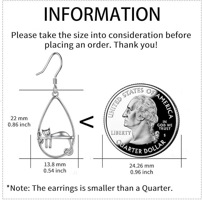 - 🐱Cat Earrings For Women: ❗To better show the details of the sterling silver cat jewelry, we will show you the jewelry up close, which means that the cat jewelry in the picture is larger than it actually looks. Please pay more attention to the size chart.❗ There is a lazy silver cat lay on branch, it looks cute and vivid. This cat earring is simple, classic and elegant. Whether worn casually or for special occasions, these sterling silver cat earrings will make you stands out and draws attention