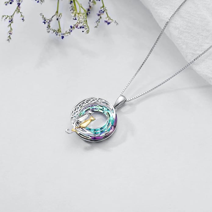 TOUPOP Cat Gifts for Cat Lovers 1 2 3 Cats Necklace Sterling Silver Cat on the Moon Pendant Necklace with Blue Circle Crystal Birthday Christmas Celtic Jewelry Gifts for Women