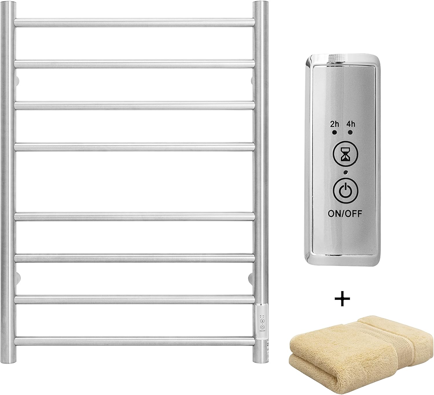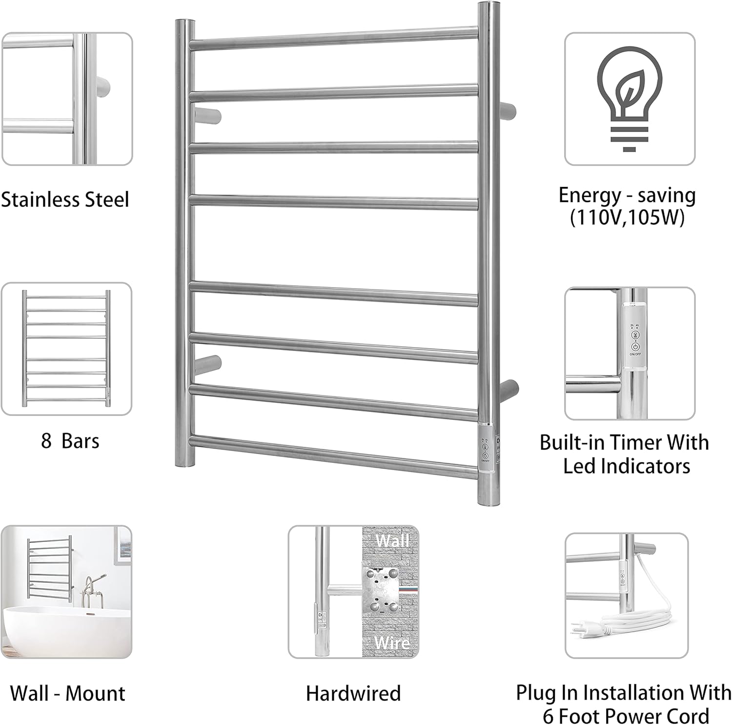 KEG Towel Warmer Wall Mounted with Built-in Timer 8 Bars Electric Stainless Steel Heated Towel Racks for Bathroom, Hot Plug-in Bath Towel Heater Brushed Nickel (TW-8-BN)