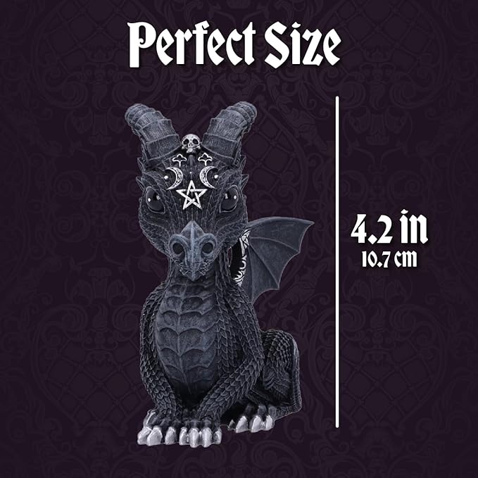 - Mythical Gothic Design: This dragon figurine merges the mystique of gothic elements with the fantasy charm of a horned dragon, featuring pentagrams, skulls, and moon symbols.