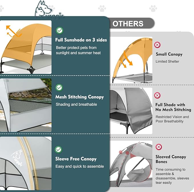 - Wider & Larger Shade Lifted Dog Bed: Comes with a large waterproof UV-proof canopy, this outside dog bed provides great shade than most other dog cots. Further more, with mesh piecing on 3 of the sides, this canopy will allow great air flow and will not block dogs' view. With this item, you will be rest assured when pets relaxing outside in summer;