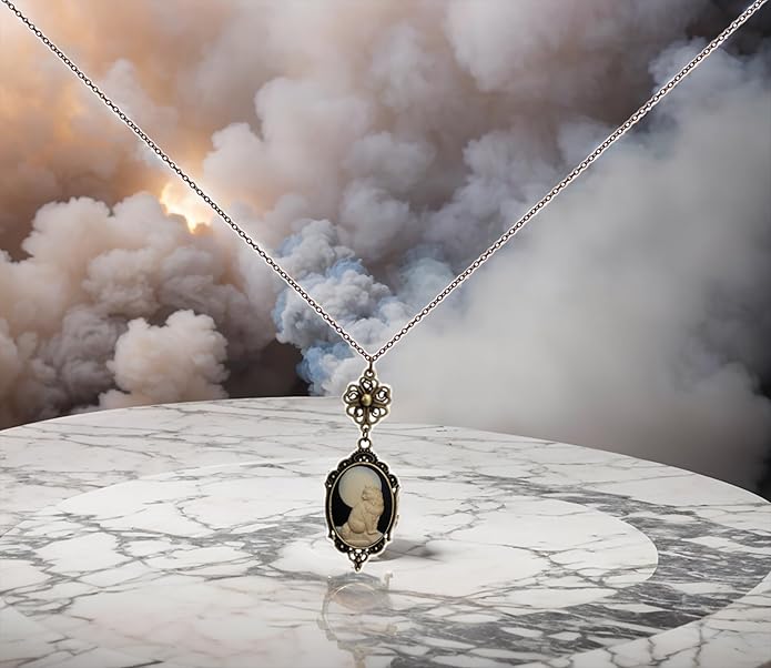 - Very good gift for present / Highest quality and unique design / Contents : Pendant, 2pc chain(18", 24"), Velvet Pouch(Deluxe pouch also help for gift use a drop of perfume and then perfect) / Material : Brass, Resin Cameo / Size : Pendant(1.49* 0.94inch), Chain(18, 24inch) / Weight : about 0.5 oz