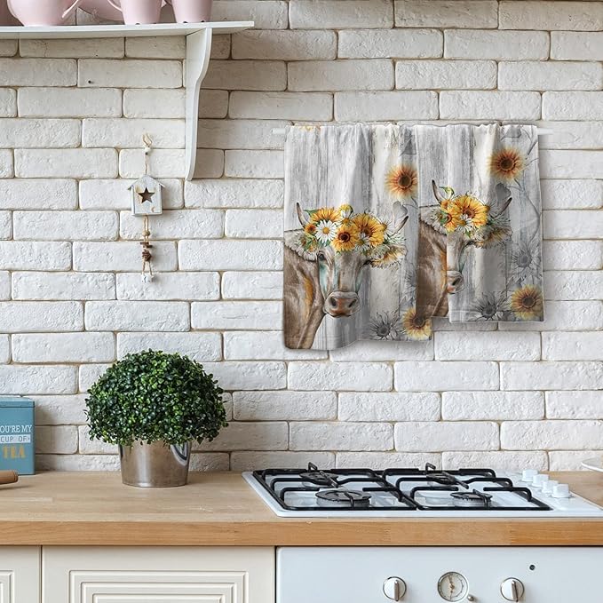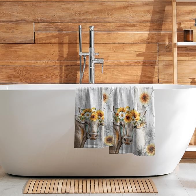 Vintage Sunflower Hand Towel Set of 2 Farm Cow Face Towels Cotton Soft Absorbent Kitchen Dishcloth Washcloths for Bathroom Home Gym