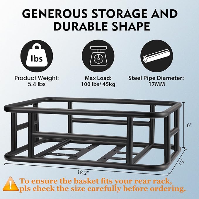 - 𝗦𝘂𝗽𝗲𝗿 𝗟𝗮𝗿𝗴𝗲 𝗦𝗽𝗮𝗰𝗲: The dimension of the basket is 18.2 x 13 x 6 inches, which can support a weight of 100lbs. Perfect for carrying backpacks,pets,daily shopping, or as a delivery bike basket.