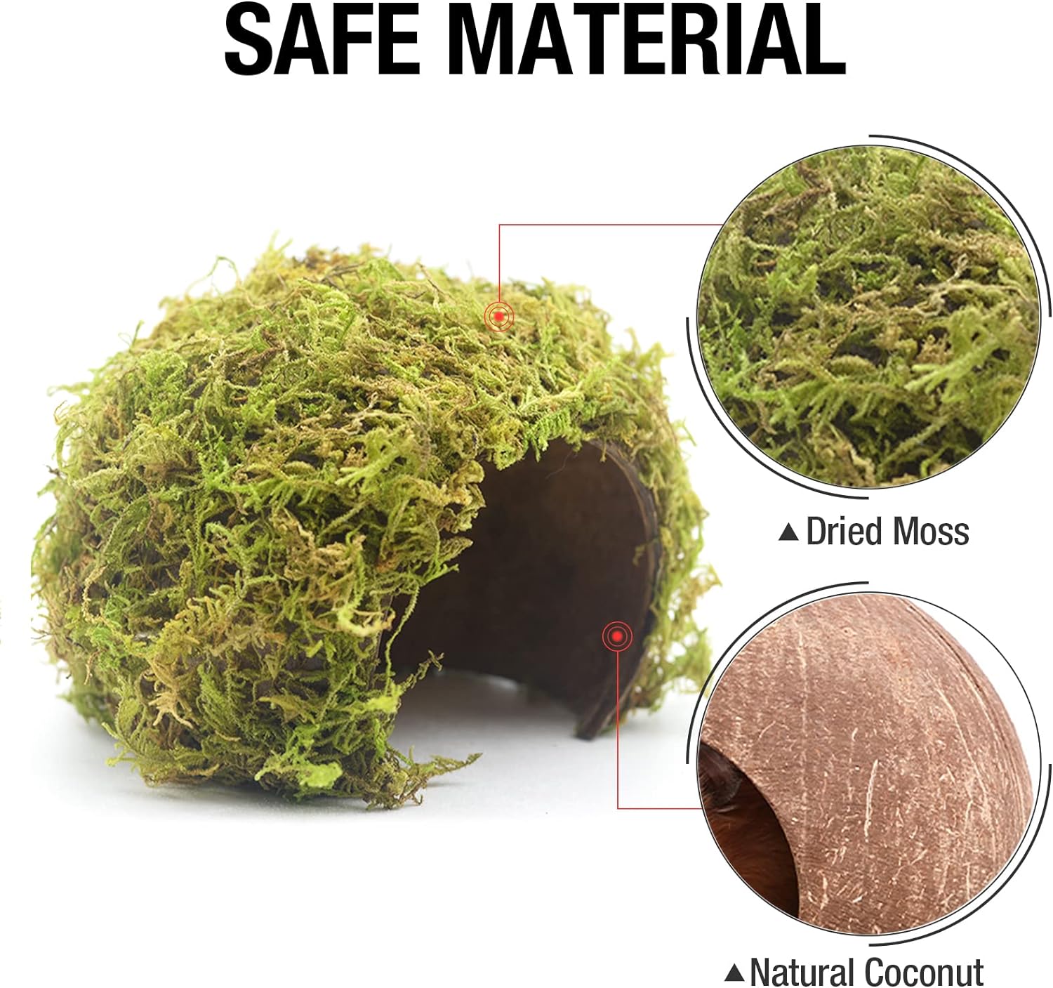 - ✨ [Safe & Edible Materials]: Crafted from hand-selected, high-quality coconut shells and natural moss harvested from mountains, this hideout uses a traditional, edible adhesive for secure bonding—designed to be safe for small pets like hamsters to chew and explore. Ideal for creating a natural, non-toxic hiding place.