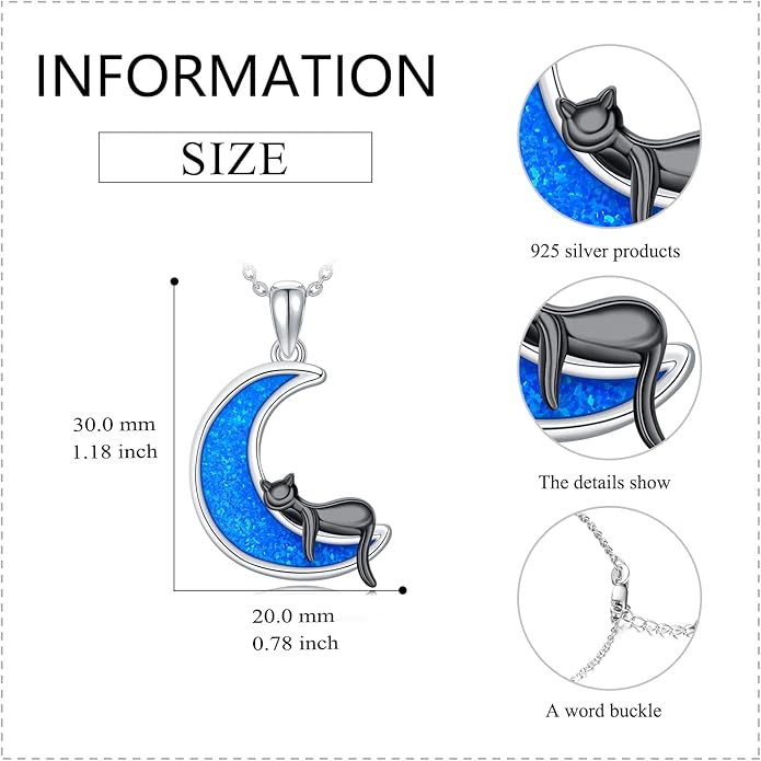 LONAGO Black Cat Moon Necklace with Created Blue Opal Sterling Silver Black Cat Necklaces Gift for Women