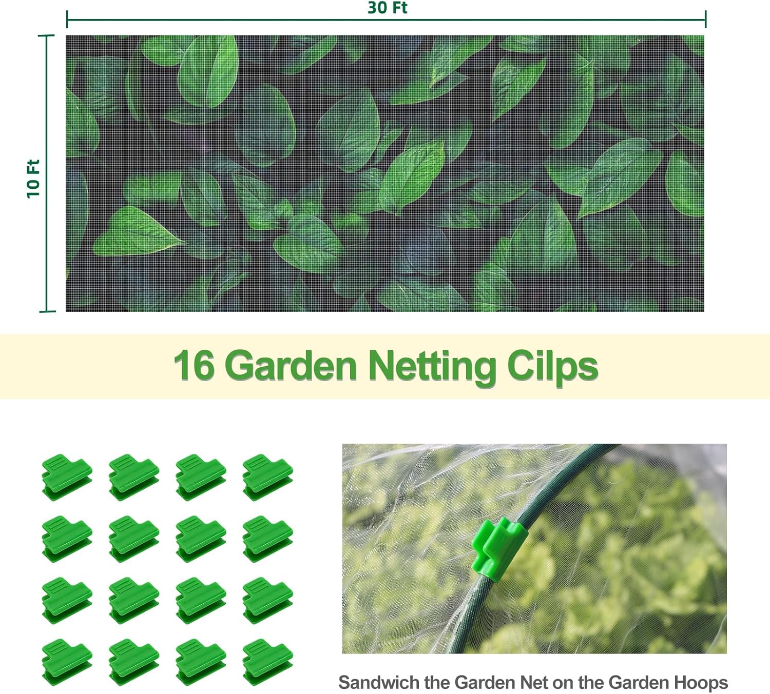 - [ Garden Plant Protector ] 10X30 feet large garden netting ultra-fine net, large enough to cover a variety of plants. And comes with 16 garden clips for you to clip the net on hoops.