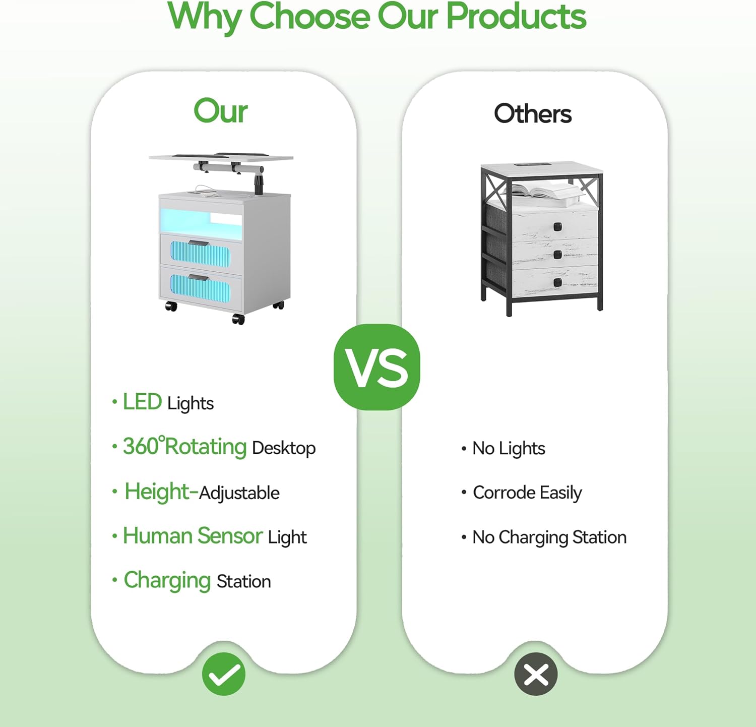 - ✅【Large Capacity Space】 The led nightstand provides spacious storage for nighttime essentials. There is a swivel desk; Open storage shelves; 2 drawers,The desktop can hold everyday items and keep them within reach.