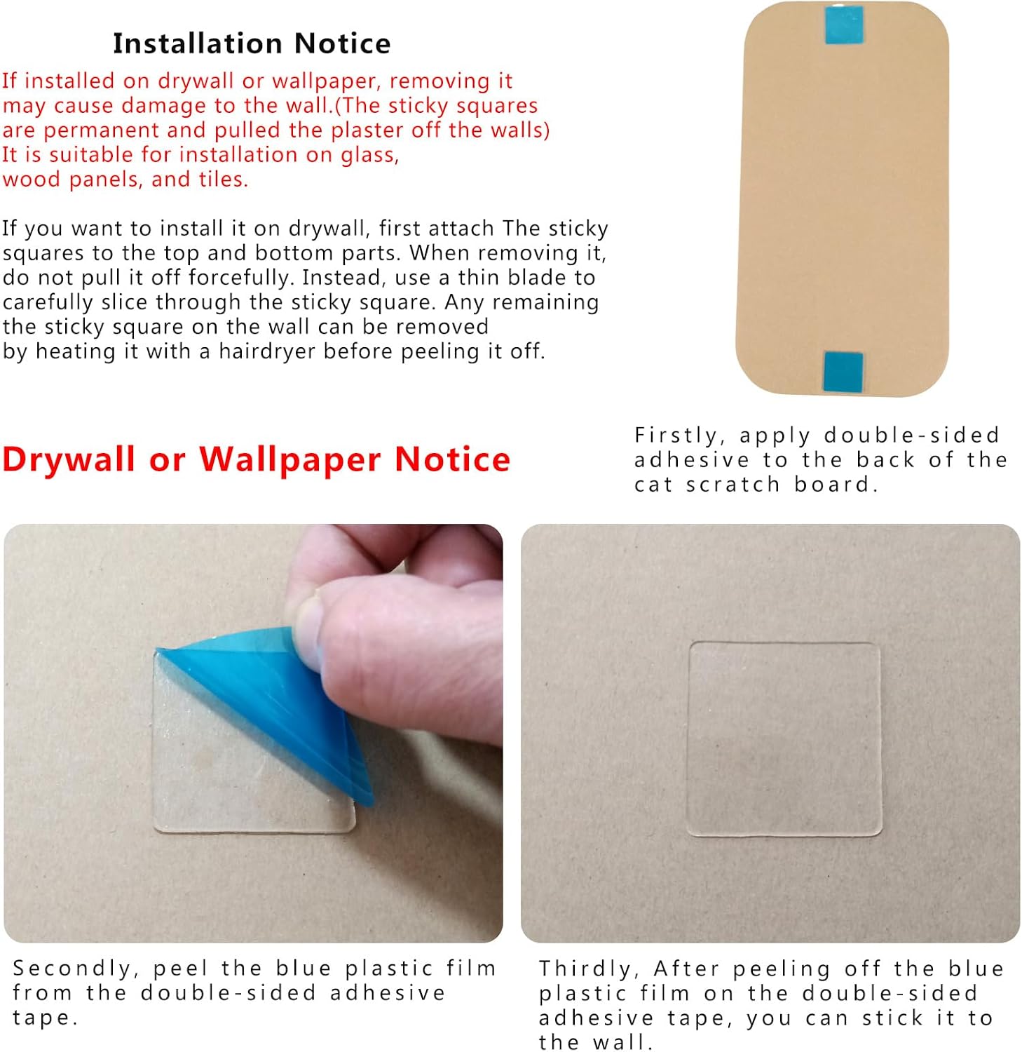 - 【EASY TO INSTALL】You can install it with two pieces of double-sided tape. And you can easily stick it to walls, doors, glass, and tiles. This Wall Cat Scratcher includes 8 pieces of double-sided adhesive tape. Perfect for all cat sizes. For larger cats to stretch their legs and hindquarter muscles, hang the scratcher higher up the wall. For smaller cats, hang it lower.