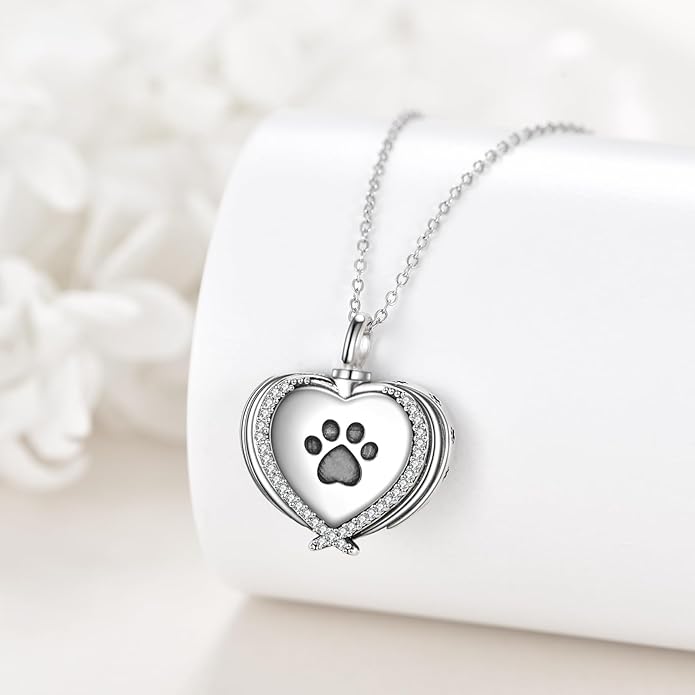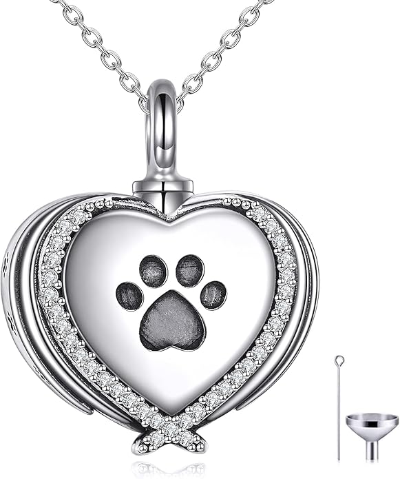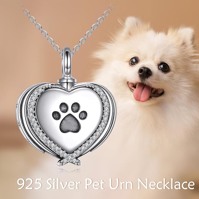 - 【DESIGN】This cremation necklace for ashes combines heart,paw print and angel wings,representing love and guardian for pets. The heart urn necklace can hold a small portions of dog/cat ashes, which will keep memories between you and your pet.