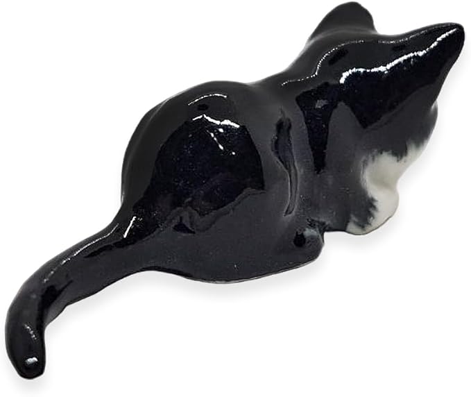 WitnyStore Tiny 1⅝" Long Black White Tuxedo Shorthair Cat Crouching Figurine - Miniature Hand Made Painted Ceramic Cats Kitten Feline Animal Cute Porcelain Decorative Collectible Figurines Décor Gifts