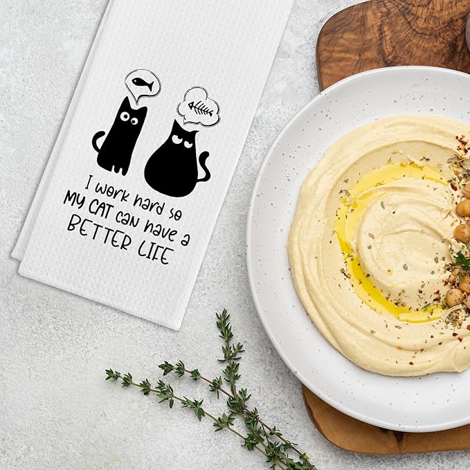 - Unique Design: Our funny kitchen towel with saying "I Work Hard So My Cat Can Have A Better Life". The simple yet cute text patterns can bright up your kitchen and surprise your family and friends. It's a perfect kitchen gift for your favourite chef.