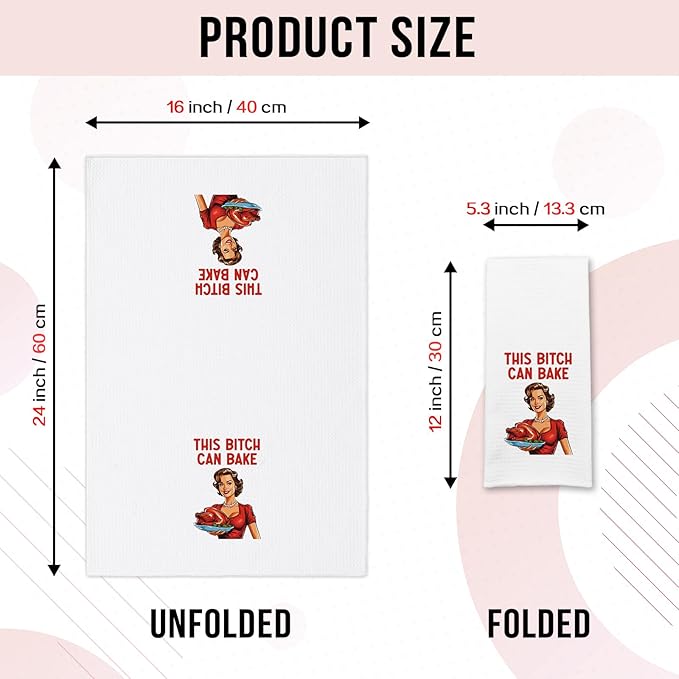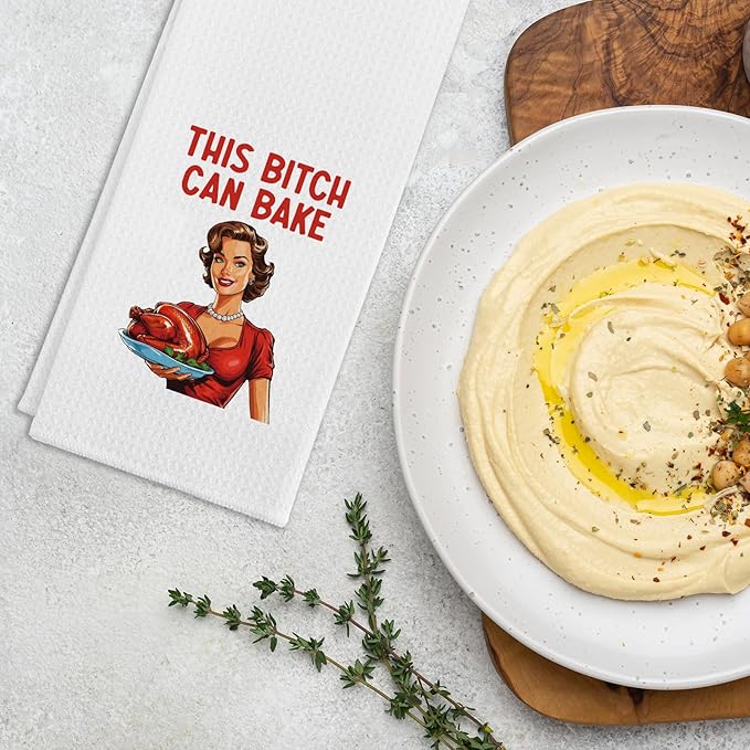 - Unique Design: Our funny kitchen towel with saying "This Bixxh Can Bake". The simple yet cute text patterns can bright up your kitchen and surprise your family and friends. It's a perfect kitchen gift for your favourite chef.