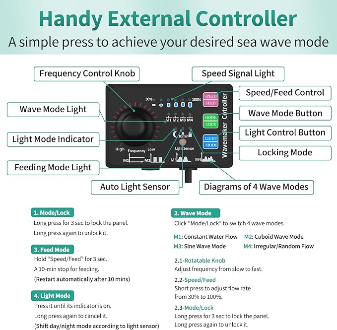 - 4 Optional Waves: Press the βmodeβ button to switch between 4 wave modes (M1/M2/M3/M4). Easily achieve multiple sea waves with a simple controlling panel.