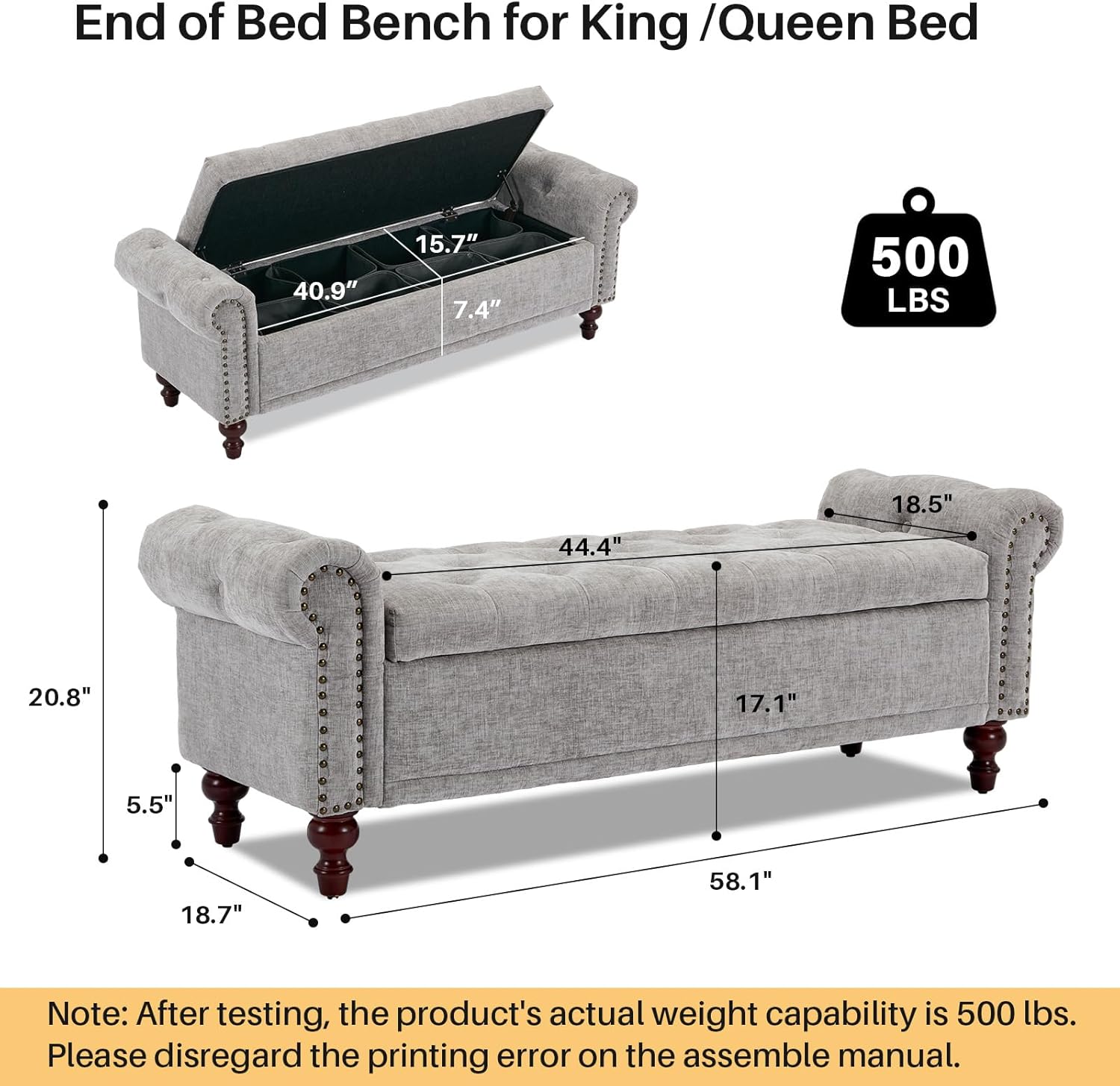 58.1'' Storage Bench Upholstered Chenille End of Bedroom Bed Bench Ottoman with Tufted Cushioned Rolled Arm Large Storage Space for Reading Living Room Entryway, Light Grey