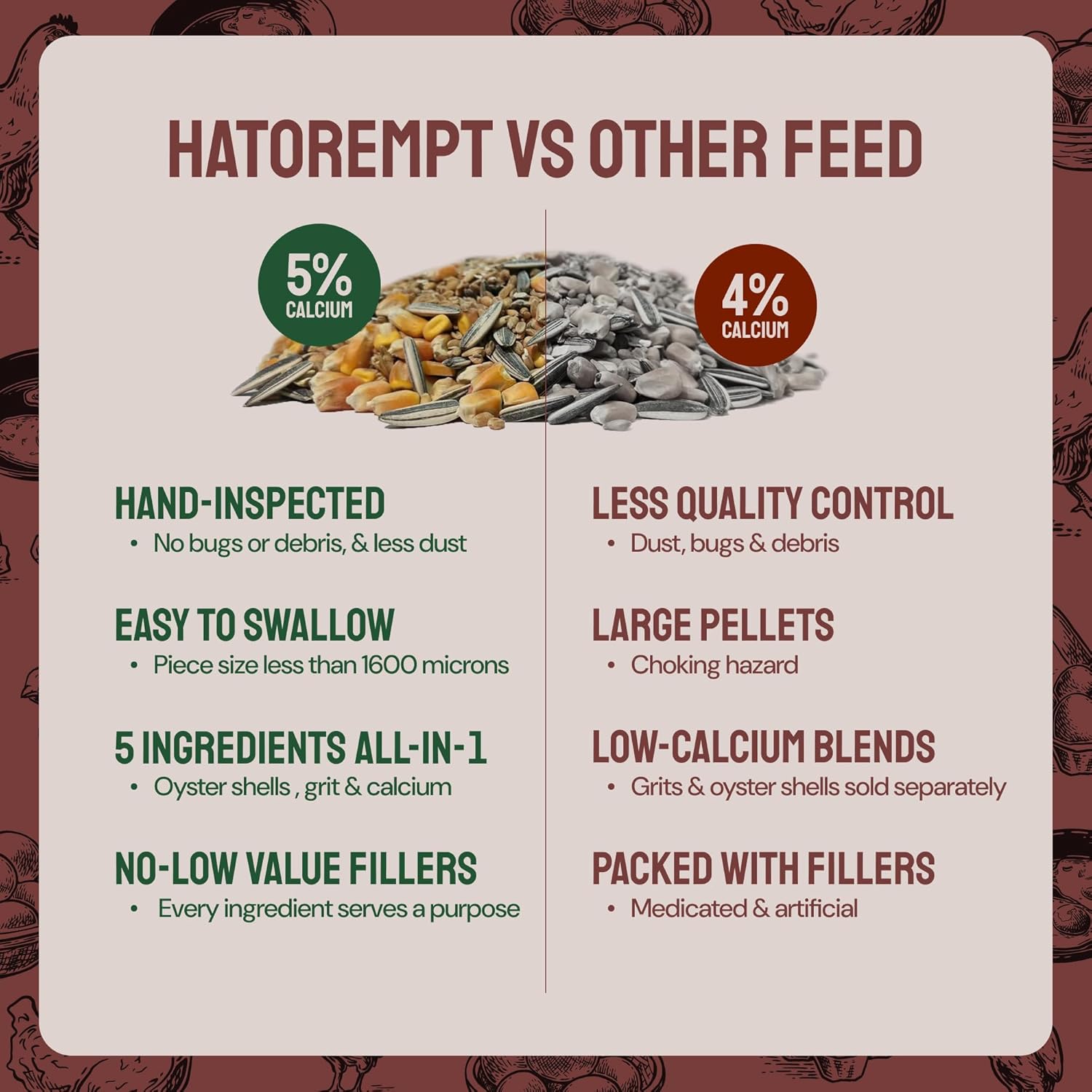 - Hand-Inspected Quality Control: Every batch of our chicken layer feed is inspected, making sure every bite is nutritious for your girls. No bugs or random debris & non-blended to avoid dust, trust Hatortempt for premium chicken scratch for laying hens