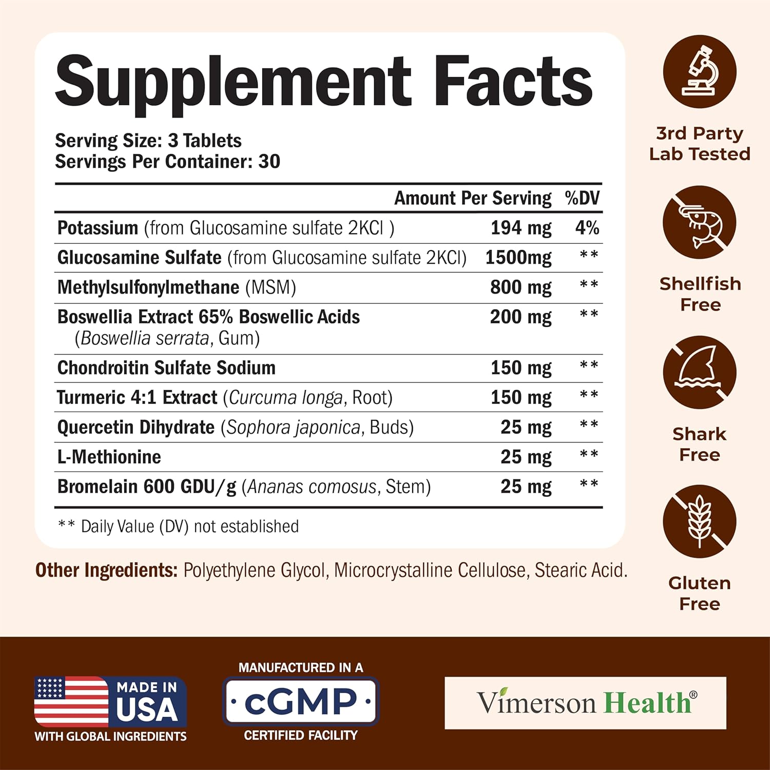 - JOINT HEALTH - All-in-one joint support supplement formulated with Glucosamine, Chondroitin, MSM, Turmeric, Quercetin, Bromelain, L-Methionine, and Boswellia. Supports long-term joint health, making it ideal for aging adults and those with active lifestyles, especially during seasonal changes or after high-impact sports or physical activity. 90 tablets.*