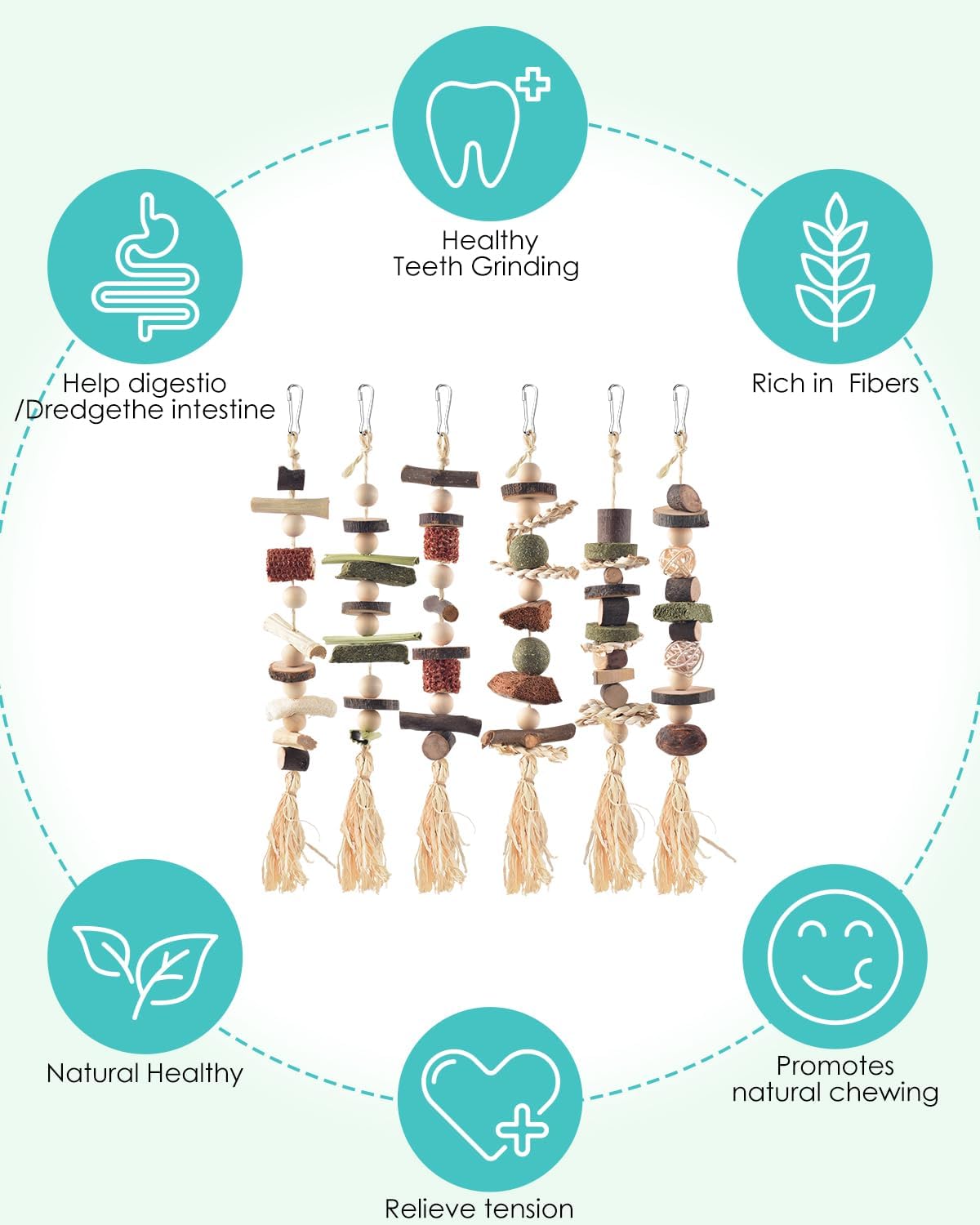 6PCS Bunny Chew Toys, Hamster Rabbit Cage Hanging Chew Toys, Natural Apple Wood Bunnies Treats, Improve Small Animal Teeth Health for Guinea Pig Chinchilla Ferret Rats Gerbil