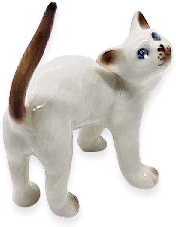 WitnyStore Tiny 2" White Brown Pointed Shorthair Siamese Cat Standing Look Up Figurine - Miniature Hand Made Painted Ceramic Cats Kitten Animal Cute Porcelain Decorative Collectible Figure Décor Gifts