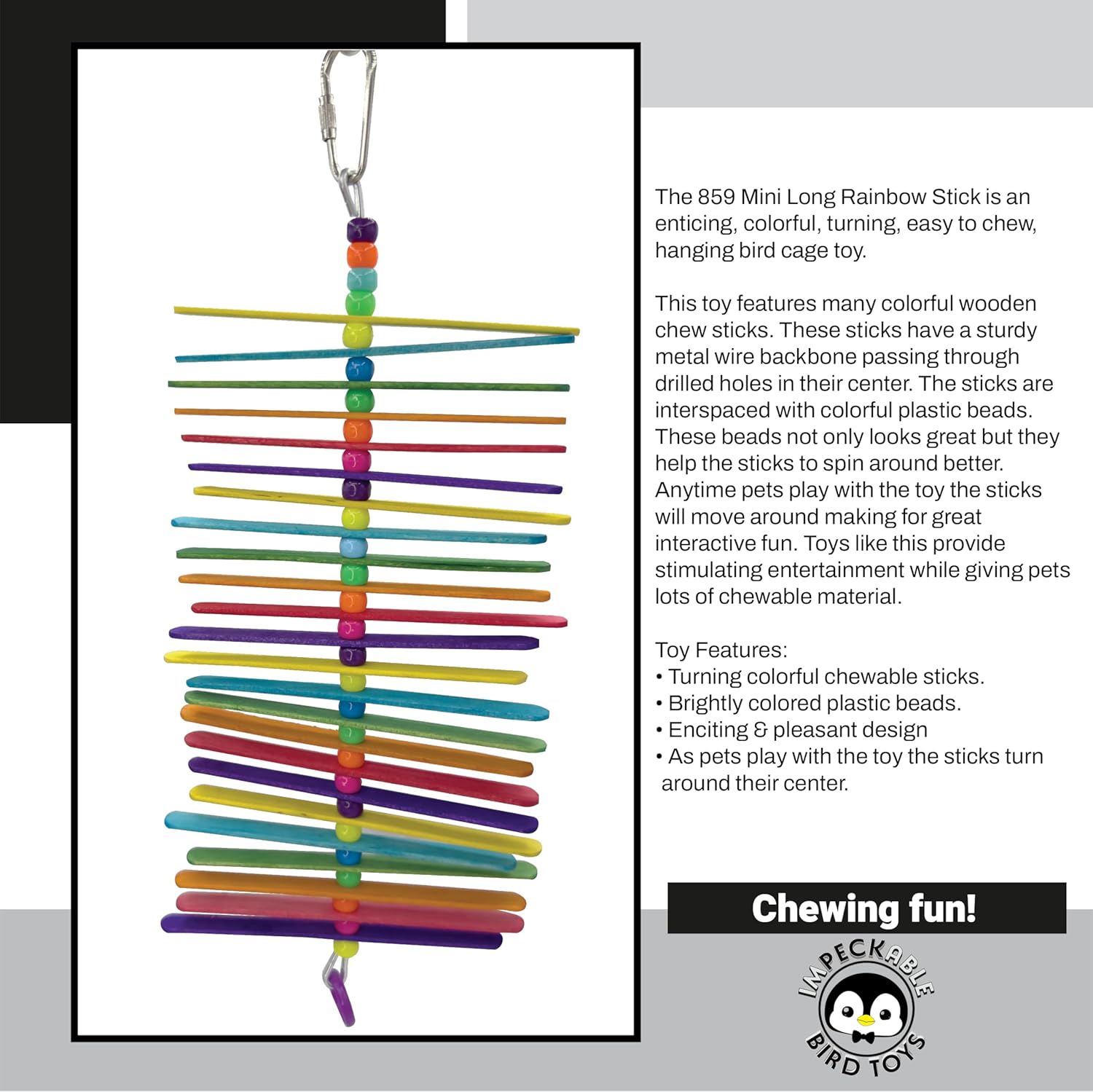 - The 859 Mini Long Rainbow Stick is a handcrafted bird cage toy that features colorful wood slats, brightly colored beads and a rubber ring on the bottom. This toy changes its shape as pets enjoy.