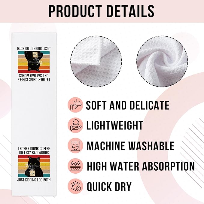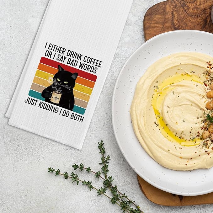 Funny Kitchen Towels for Women, I Either Drink Coffee or I Say Bad Words Dishcloths, Coffee Lovers Gifts, Black Cat Hand Towels with Sarcastic Saying, Kitchen Decor Gifts for Hostess Chef