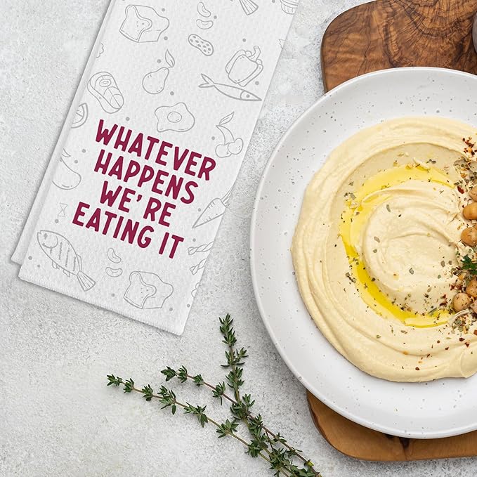 - Unique Design: Our funny kitchen towel with saying "Whatever Happens We're Eating It". The simple yet cute text patterns can bright up your kitchen and surprise your family and friends. It's a perfect kitchen gift for your favourite chef.