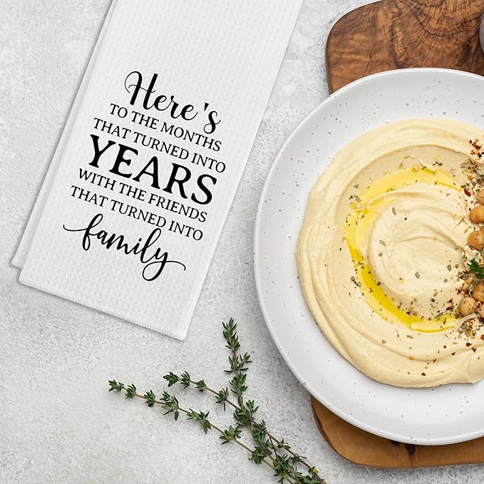 - Unique Design: Our funny kitchen towel with saying "Here's to The Months That Turned into Years with The Friends That Turned into Family". The simple yet cute text patterns can bright up your kitchen and surprise your family and friends. It's a perfect kitchen gift for your favourite chef.