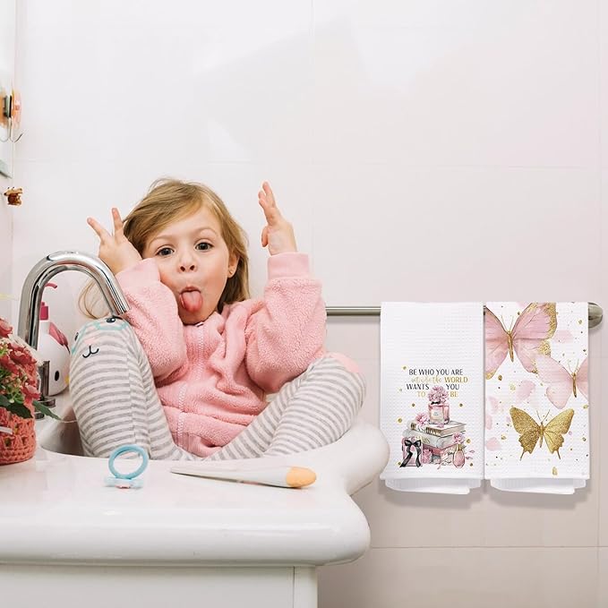 Pink and Gold Bathroom Decor Hand Towels Set of 2, Trendy Pink Fashion Floral Perfume Butterfly Decorative Hand Towels for Bathroom, Inspirational Gifts for Women, 16x24 Inch