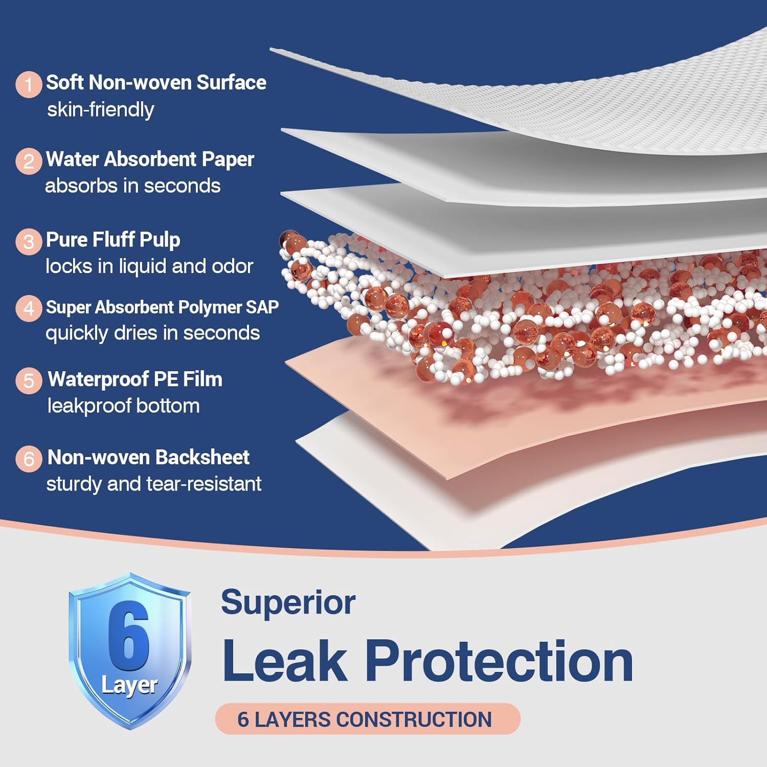 - Superior Leakproof: Featuring 5 layers of leak lock protection, each layer of MKISS chucks pads disposable adult effectively absorbs and locks liquids without leakage, and is a good protector for mattress, floor, chair and furniture