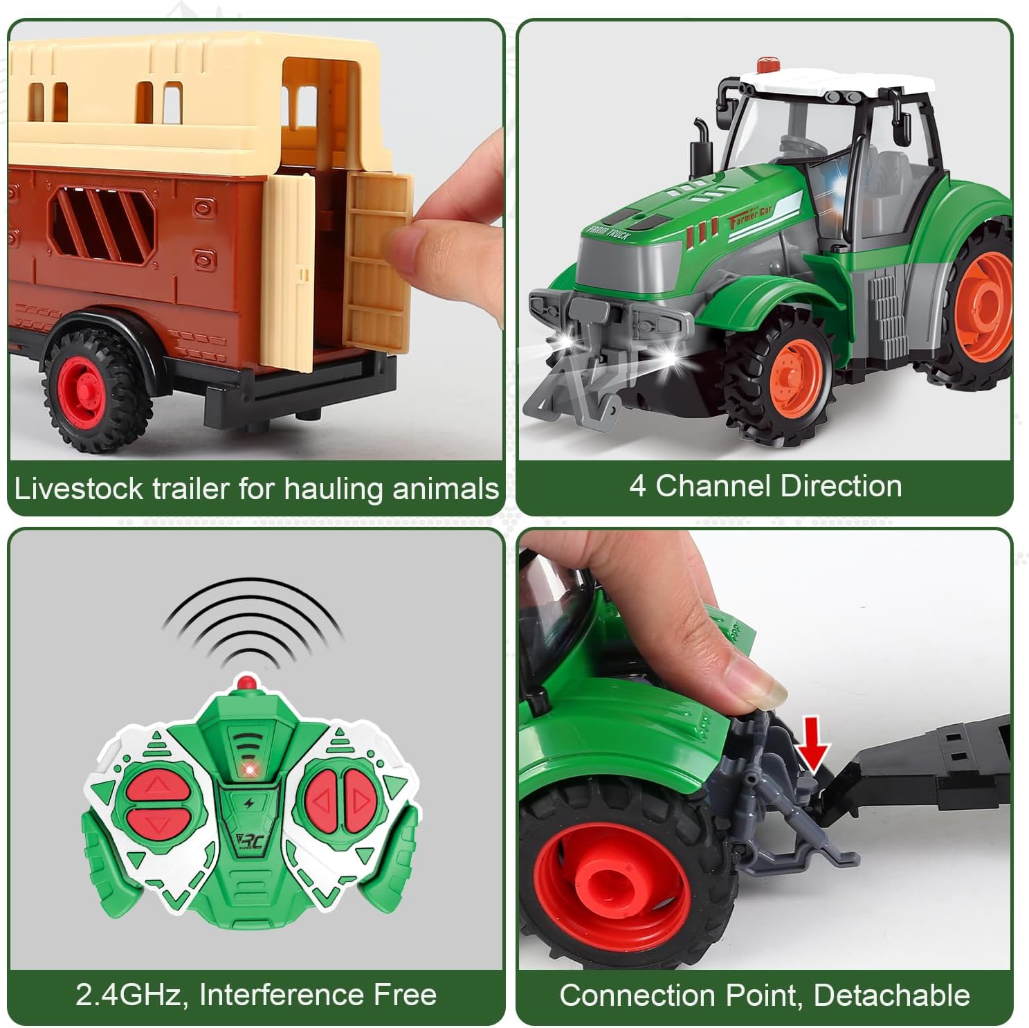 fisca Remote Control Tactor Toy Set & 33PSC Farm Vehicle Playset - Animal Figurines ,2.4GHz 1/24 Scale RC Tractor,Livestock Trailer, Fence with Light for Kids Age 4, 5, 6, 7 and Up Years Old