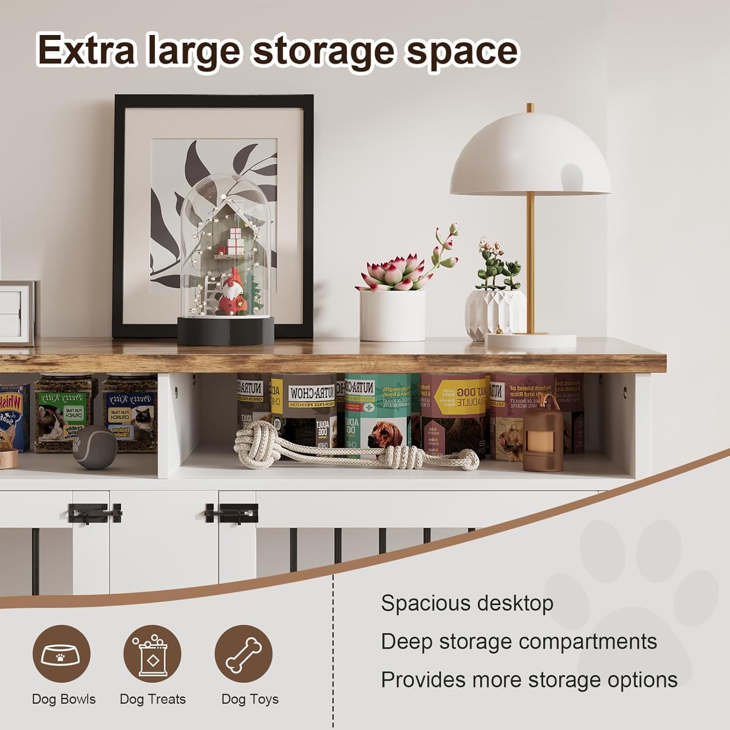 - PLENTY OF STORAGE SPACE: This indoor dog kennel indoor has 2 spacious storage compartments on the upper part of the crate, which is convenient for you to store dog food, dog toys, leashes and other essentials, fully meeting your storage needs for pet supplies, and the top counter can be used for your decorations, photo frames and so on