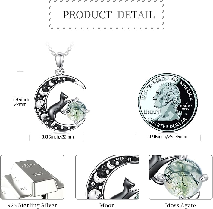 - Black Cat Jewelry Material: Black cat necklace for women is made of 925 sterling silver and moss agate, ensuring its glossiness and durability, hypoallergenic and safe for sensitive skin. The intricate detailing and sleek finish make them a standout accessory for any occasion