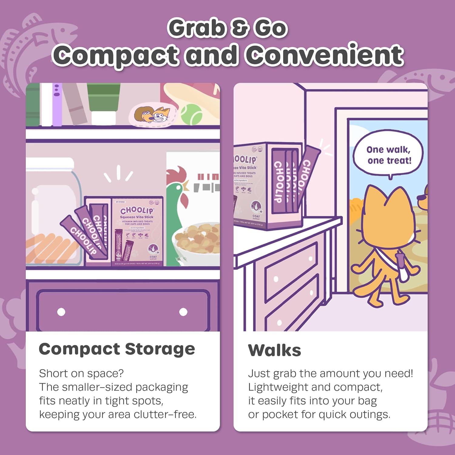 - COMPACT DISPENSER PACK: This Skin and Coat Support pack includes 49 sticks to treat your cat or dog. Itโs perfect for quick, grab-and-go use, easy to carry in a bag for trips, or convenient to keep near your pet supplies.