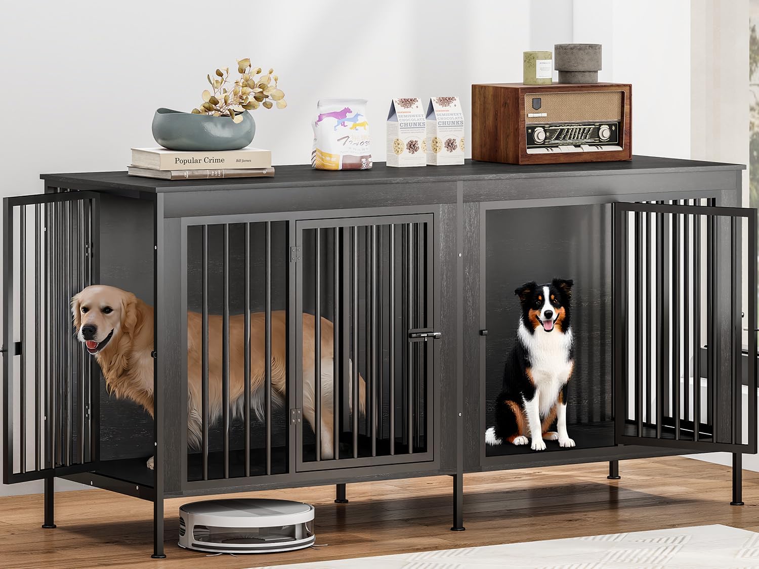78 Inch Dog Cage Furniture for 2 Large/Medium Dogs with Removable Divider, Extra Large Double Doors Dog Kennel, XXL Thick Wooden Dog cage Furniture, Durable and Sturdy, Dark Grey