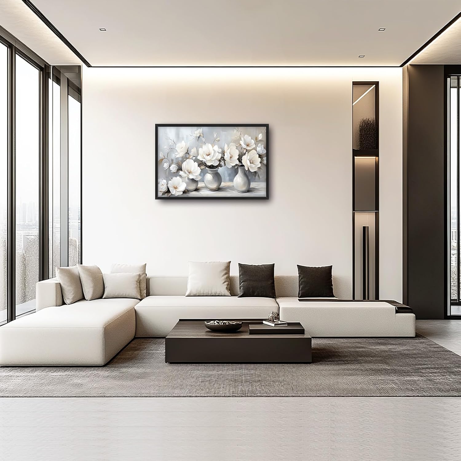 Large Farmhouse Floral Wall Art for Living Room, Framed Oversized White Flower Vase Wall Decor Grey Floral Canvas Painting Pictures Modern Artwork for Bathroom Bedroom Office Dining Room 36"x24"