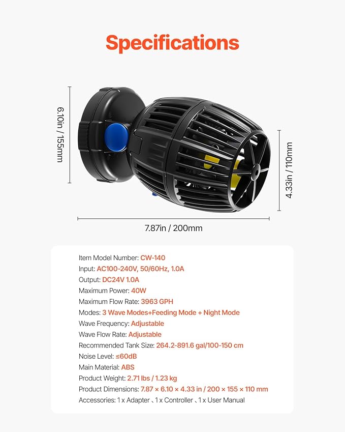 - Compact & Efficient: Designed for efficiency, our small yet powerful fish tank wave maker delivers up to 3963 GPH with only 40W of power consumption. Ideal for 50-70 cm aquariums, it operates securely with a 24V DC low-voltage power supply