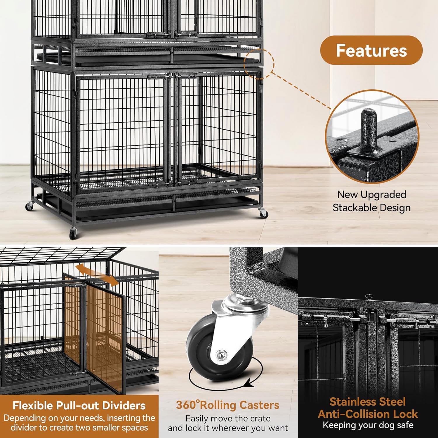 Oranland 48 inch Wire Dog Crate with Divider,2025 New Upgraded Stackable Dog Crate for Nursing Mother Dogs & Puppies,Large Dog Kennel with Reinforced Frame,Sturdy Locks Design/Removable Tray