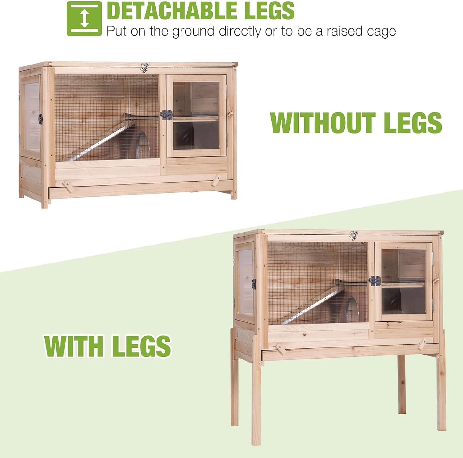 - Adjustable And Removable Legs: Comes with sturdy, removable legs for versatile placement. Use as a free-standing bunny cage or on a flat surface