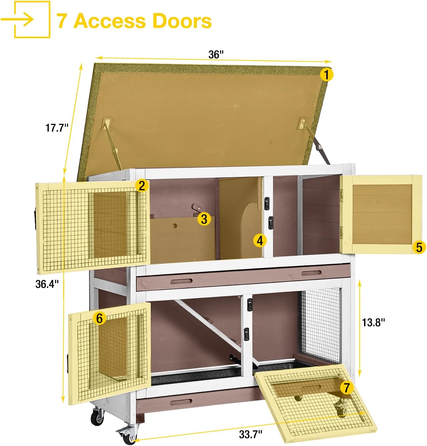 - Multiple Access Points for Convenience: With seven access doors, this hutch offers easy access to all compartments. This design makes cleaning and feeding your rabbits more convenient and efficient