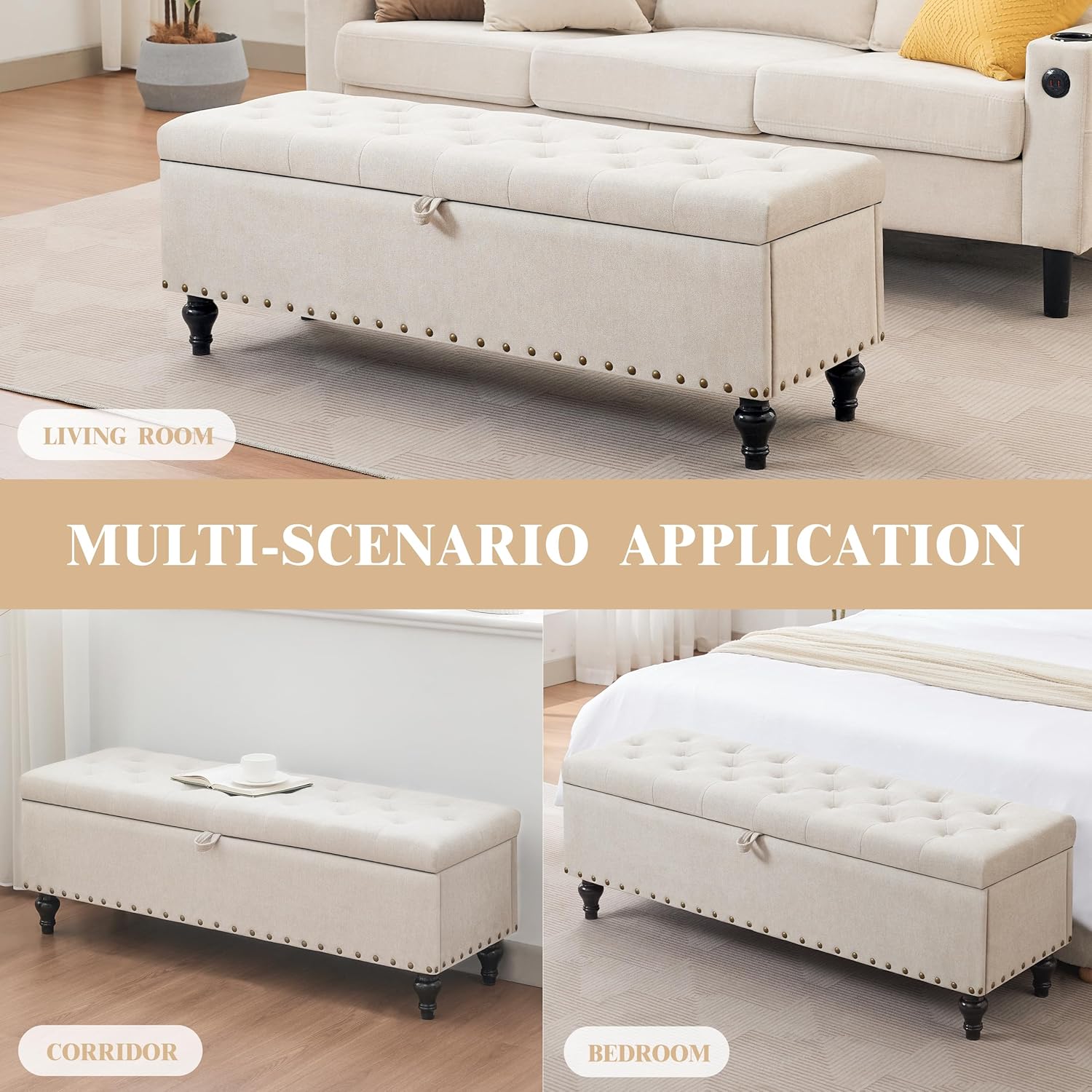 Mangodan51” Linen End of Bed Storage Bench, Tufetd Upholstered Storage Ottoman Bench with Safety Hinge, 330 lb Large Ottoman with Storages for Living Room, Entryway & Bedroom, Window Benches, Beige